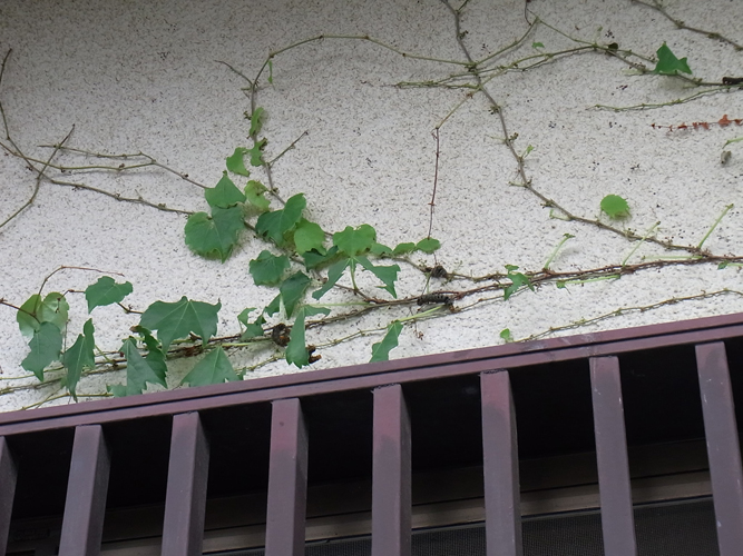 芋虫が壁に這っていたツタの葉っぱを食い荒らしてました・・・